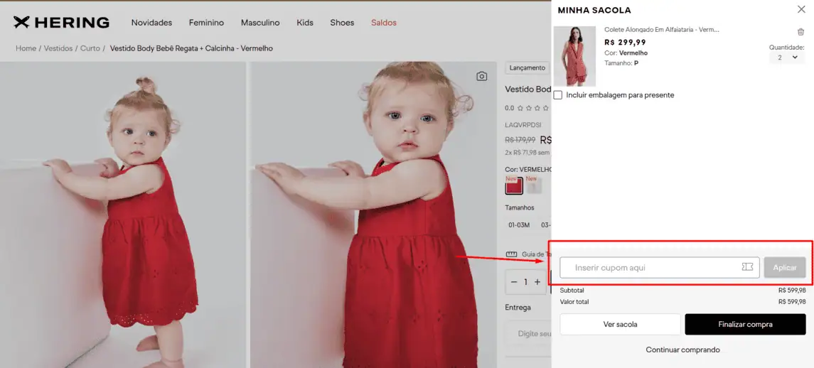 - Adicione o código copiado no campo de cupom da loja da Hering Kids;