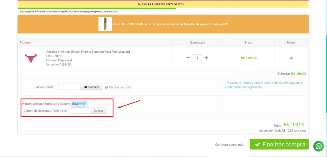 - Adicione o código copiado no campo de cupom da loja da MarétoaBiquínis;