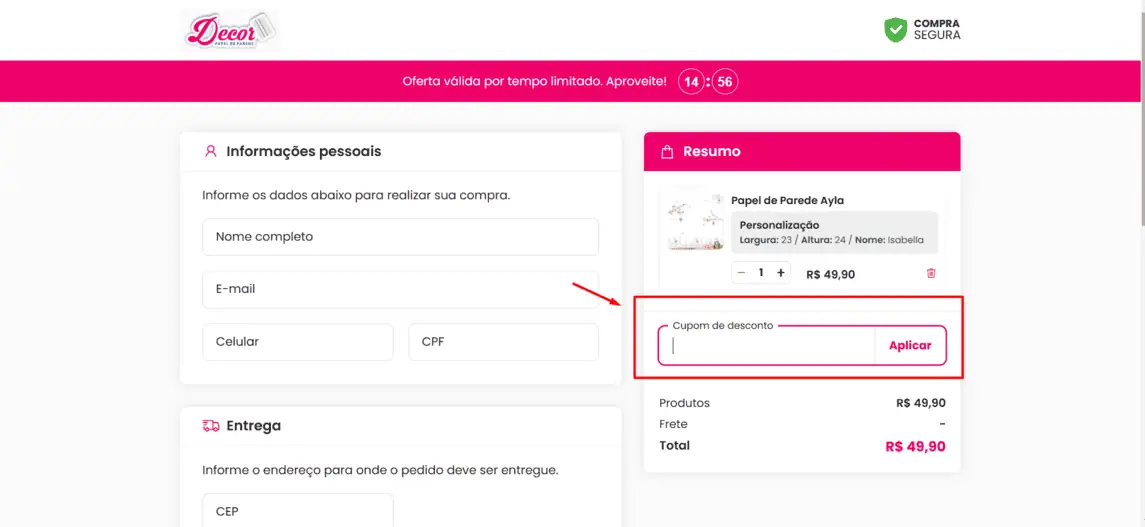 - Adicione o código copiado no campo de cupom da loja da PapelDecor;