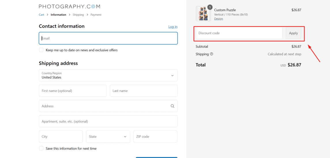 - Adicione o código copiado no campo de cupom da loja da Photography.com;